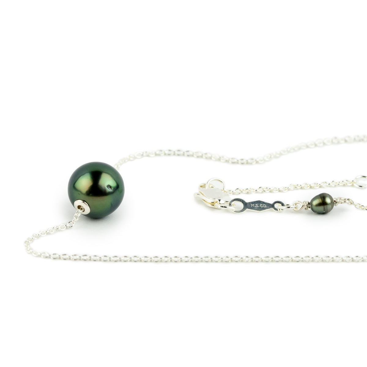 Peacock Green 9.2mm Tahitian Pearl Solitaire Necklace on Sterling Silver