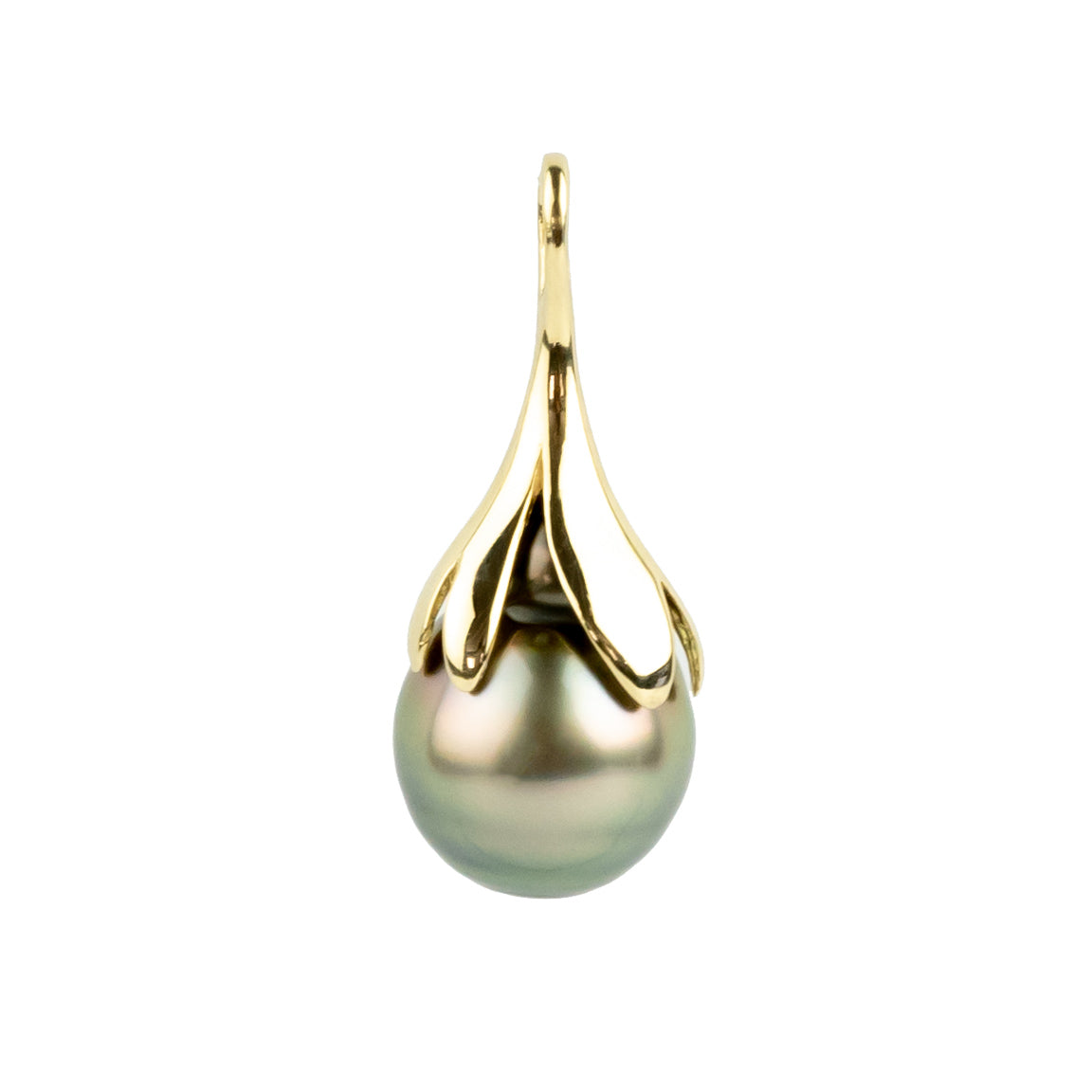 Plum Green 10mm Tahitian Pearl Marguerite Pendant on 14K Yellow Gold
