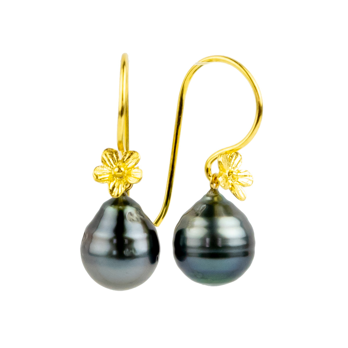 Iridescent Blue Circled Tahitian Pearl Hibiscus Hook Earrings