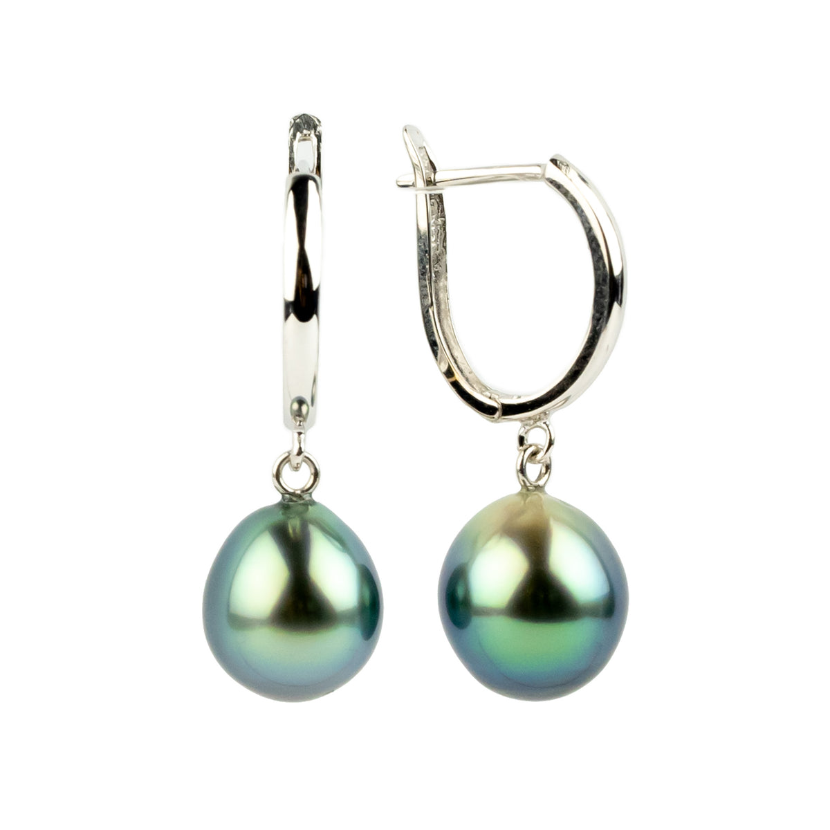 Blue Green Tahitian Pearl Teardrop Dangle Earrings on Sterling Silver