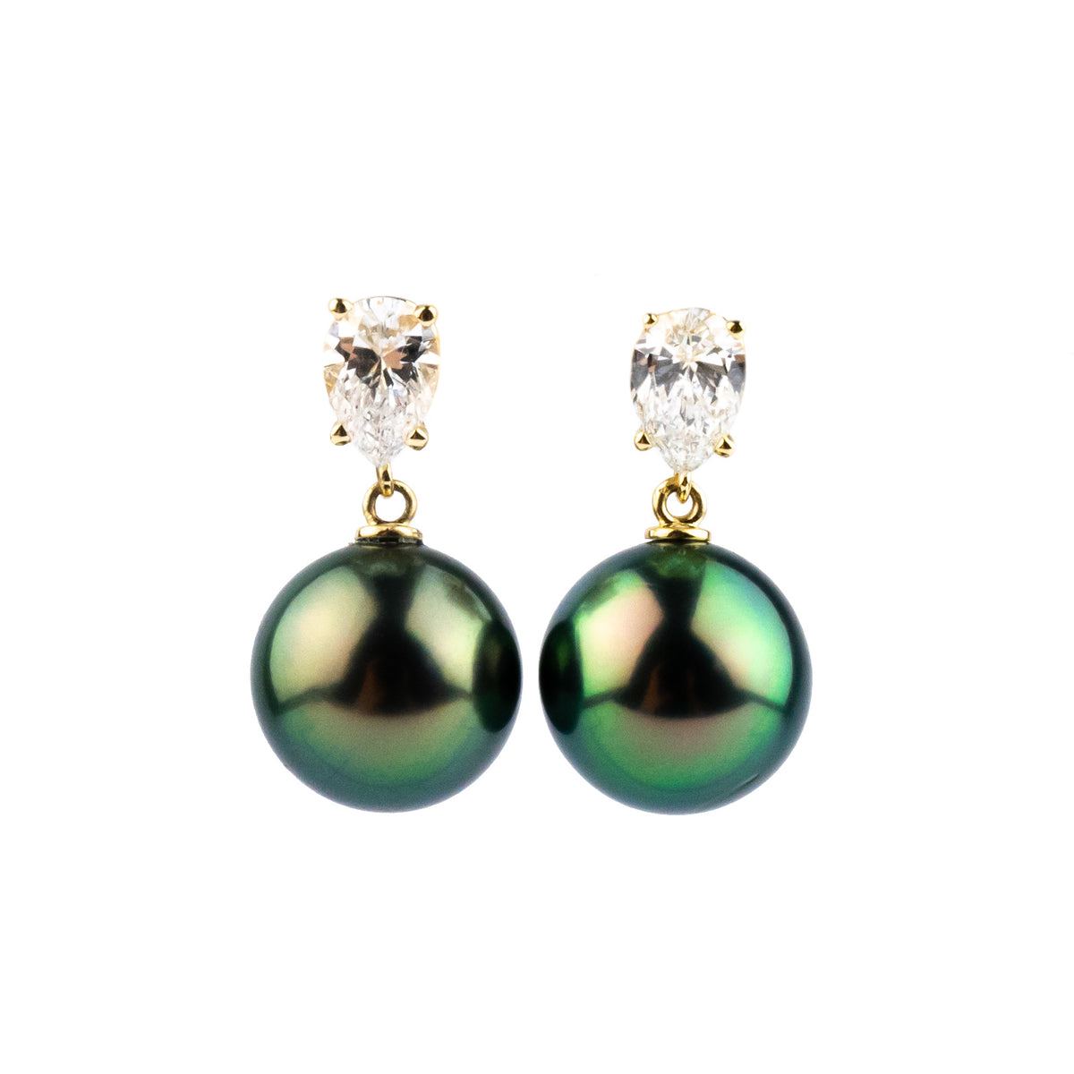 Deep Peacock Green Tahitian Pearl & Diamond Toru Earrings on 14K White Gold