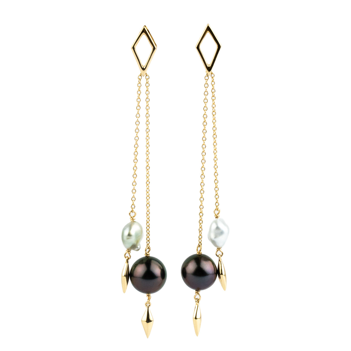 Tahitian Pearl & Keshi Geometric Chain Dangle Earrings on 14K Gold
