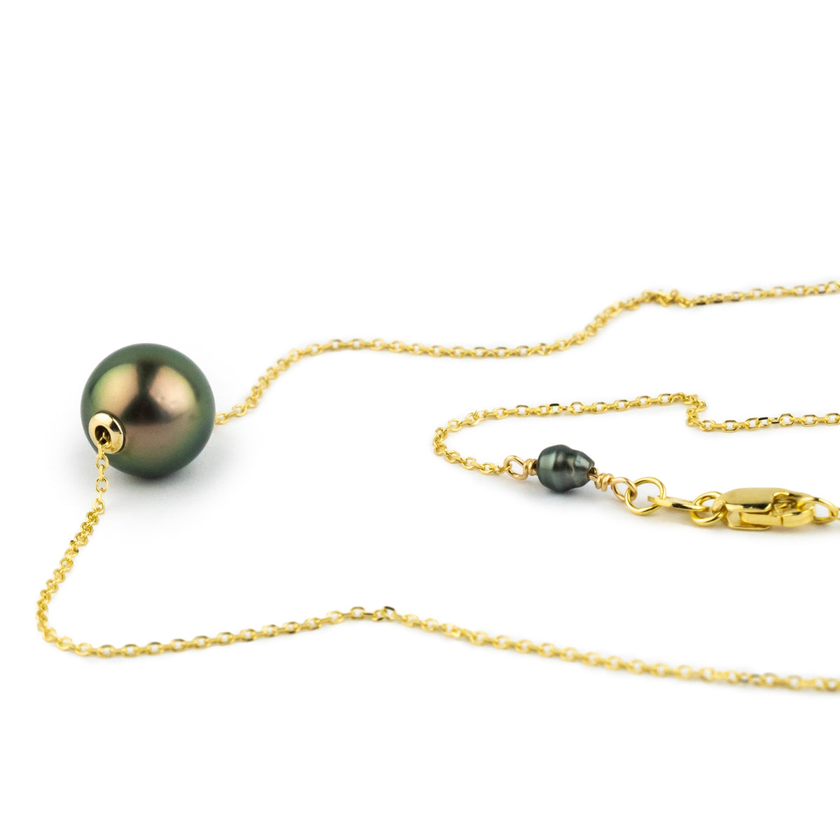 Golden Peacock Green 9.5mm Pearl Solitaire Necklace on 14K Yellow Gold