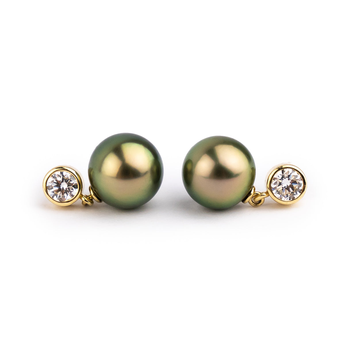 Golden Pink Green Tahitian Pearl & Diamond Toru Earrings on 14K White Gold