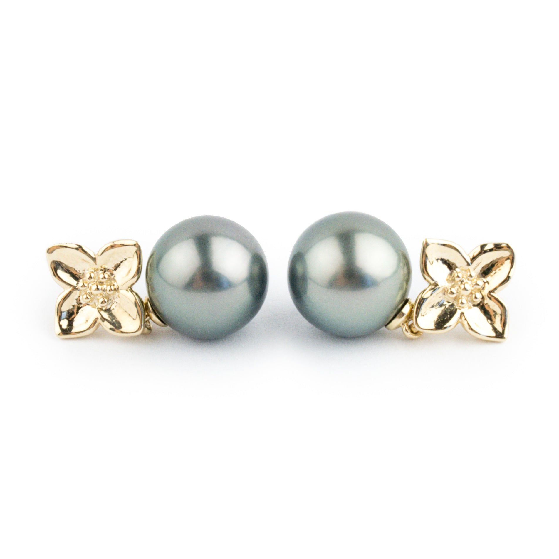 Peacock Green 11.2mm Tahitian Pearl Plumeria Dangle Earrings