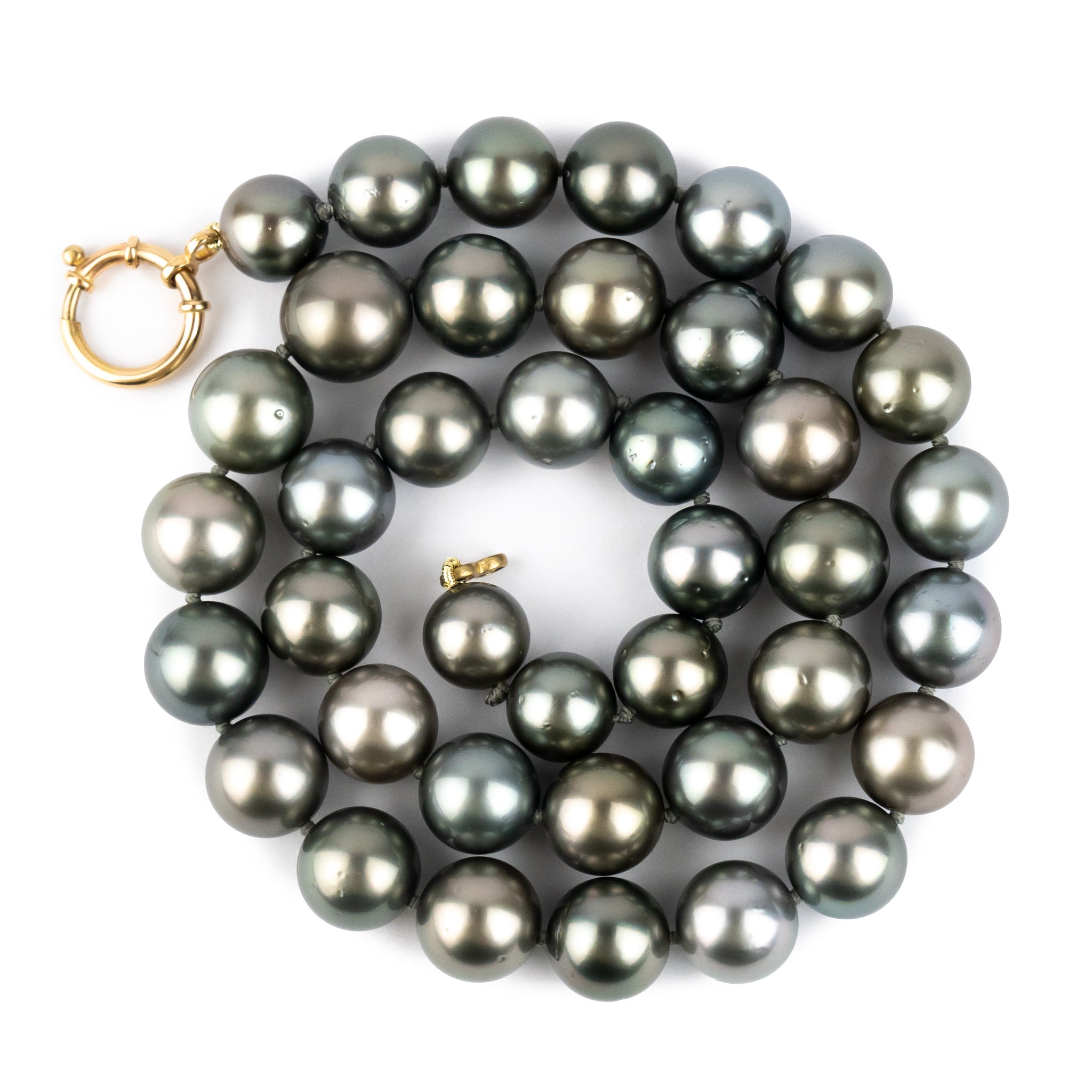 The 39 round Kamoka Tahitian pearls on this statement making, large necklace are a stunning blend of silvery tones.