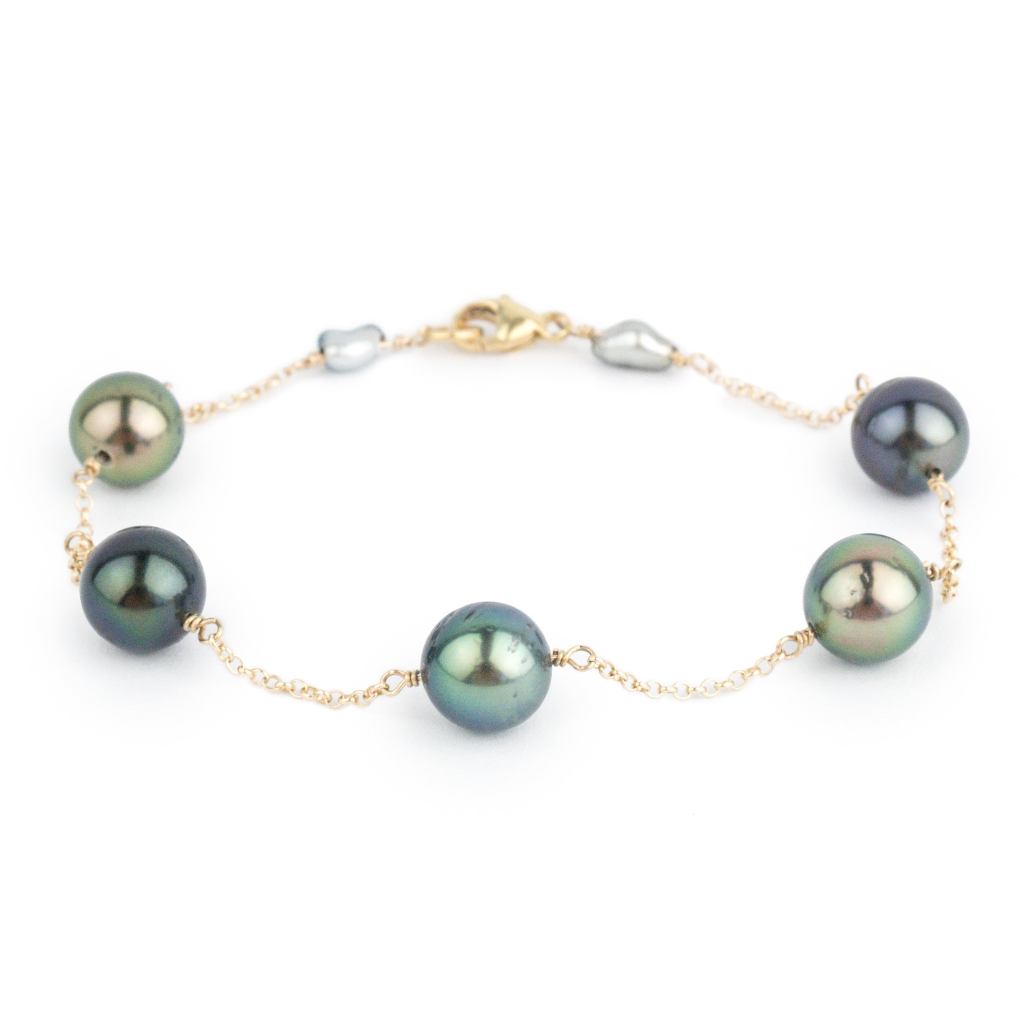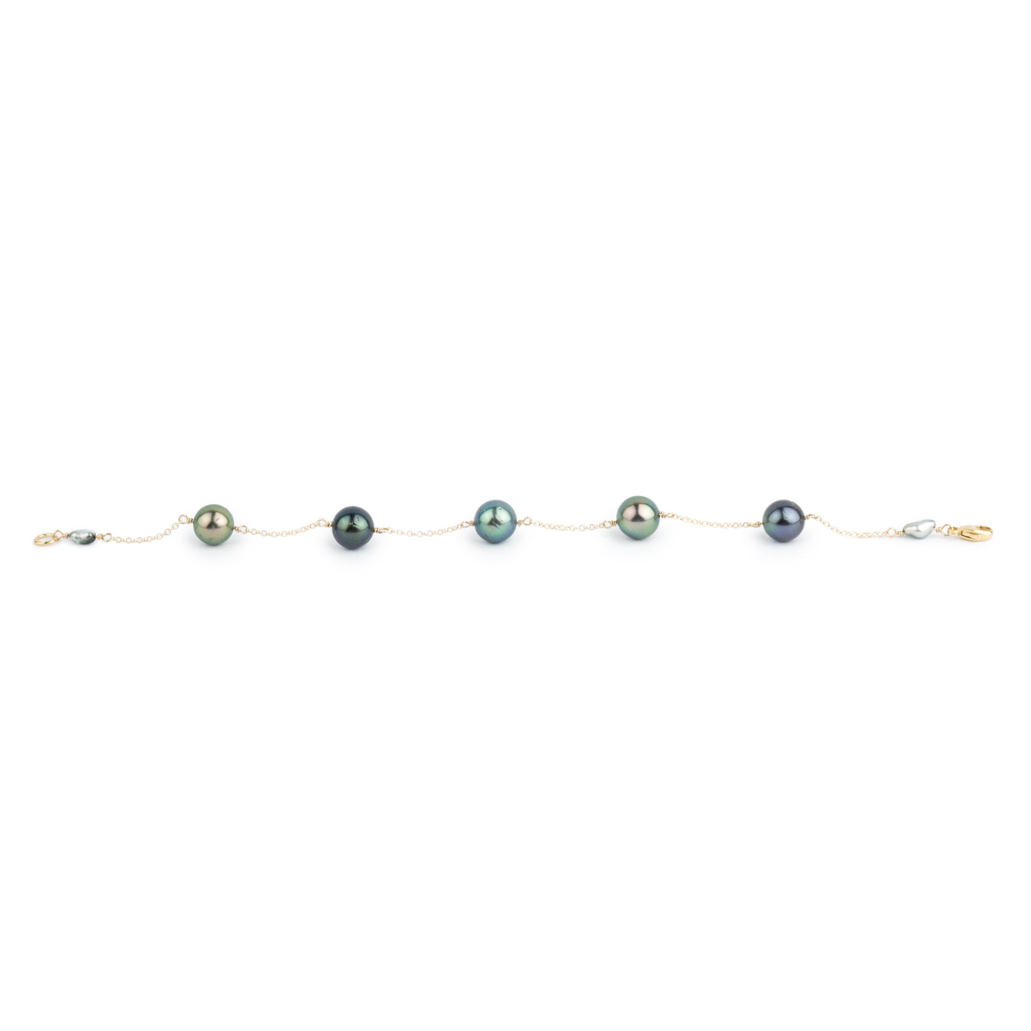 Five stunning Kamoka Tahitian pearls are strung on high quality 1mm, 14/20 gold filled chain creating an easy-to-wear, classic bracelet commonly knows as a Tin-Cup.