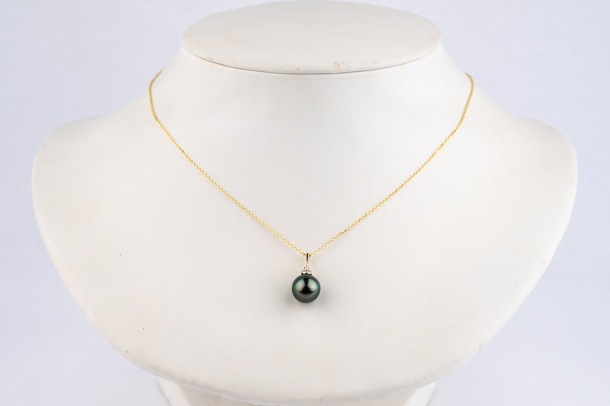 The pearl has exceptional luster and has a stunning, green body, with aubergines and golds to its center, all surrounded by a strong indigo halo. There are very minor imperfections only noticeable upon close inspection.