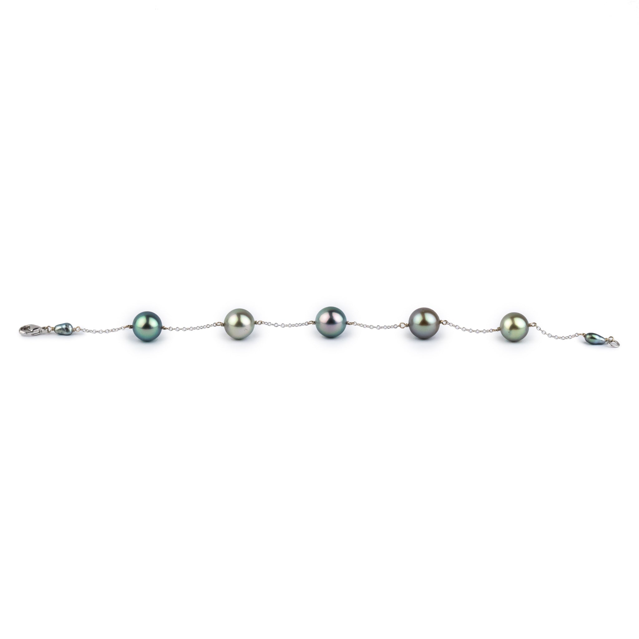 This tin-cup style bracelet is made with high quality 1.3mm cable, 14K white gold chain and five Kamoka Tahitian round pearl beauties.