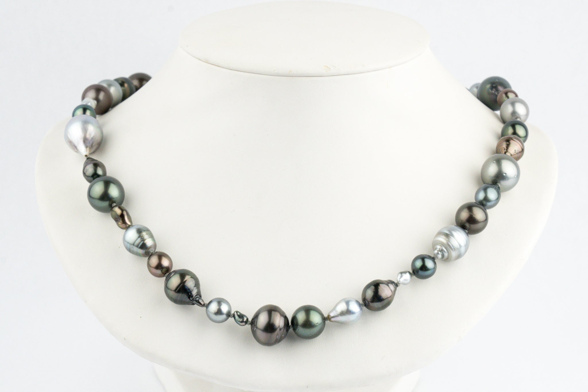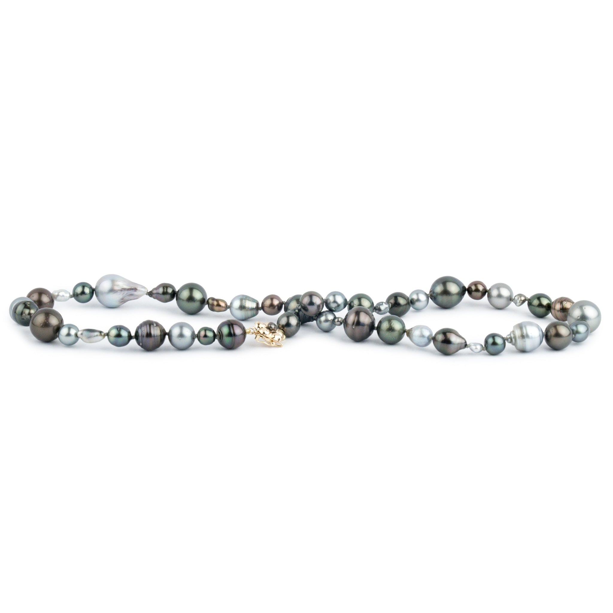 The pearls on this one-of-a-kind strand represent what can be found in a Tahitian pearl harvest, from a 5.3mm keshi and 8.9mm semi-baroque to a 10.8mm baroque and a 12.5mm circled drop.