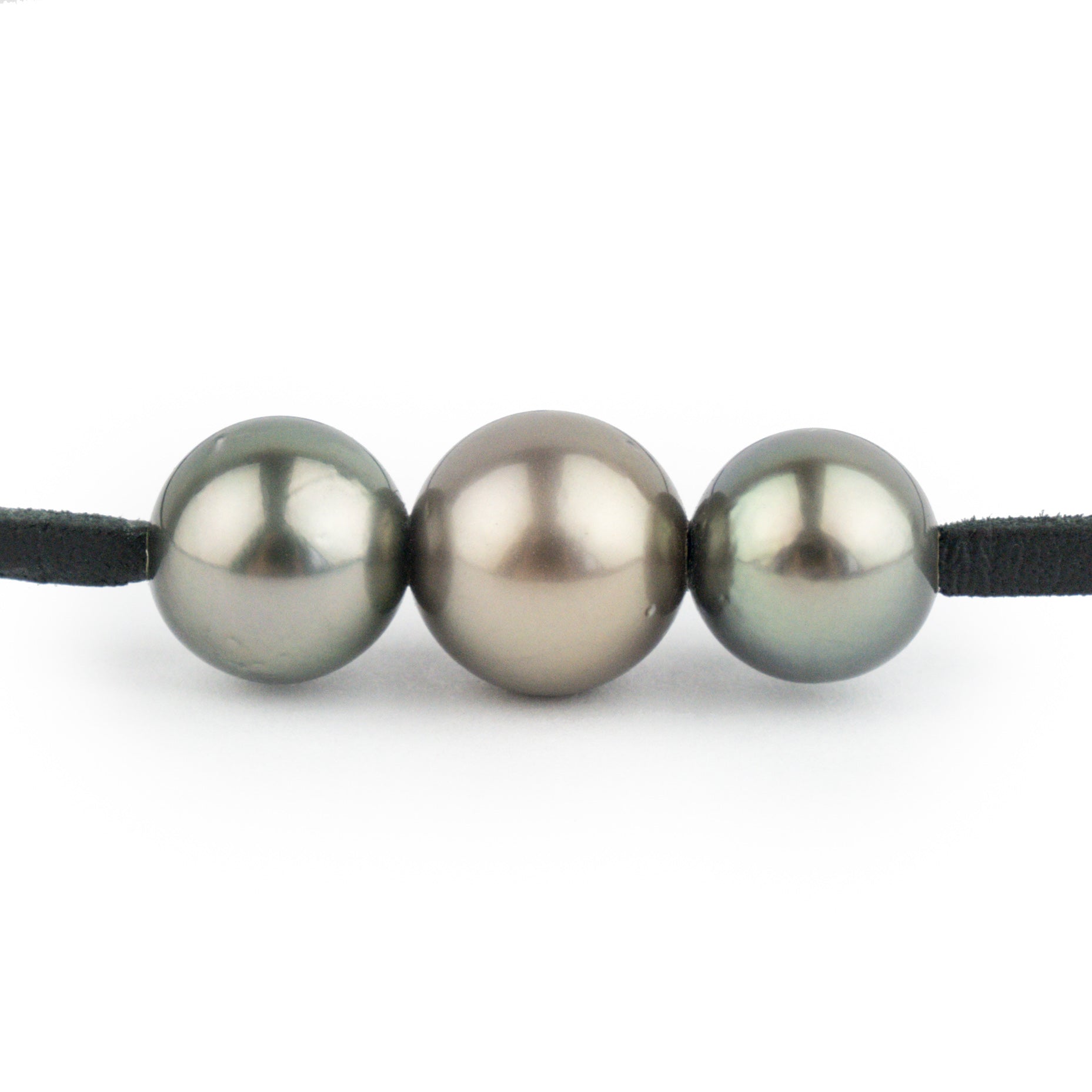 Statement making, perfect for all genders and wearable anywhere, these necklaces take our well-loved leather design and makes it pop. The center pearls are an approximately 11.5mm and are flanked by two 10.2mm pearls.