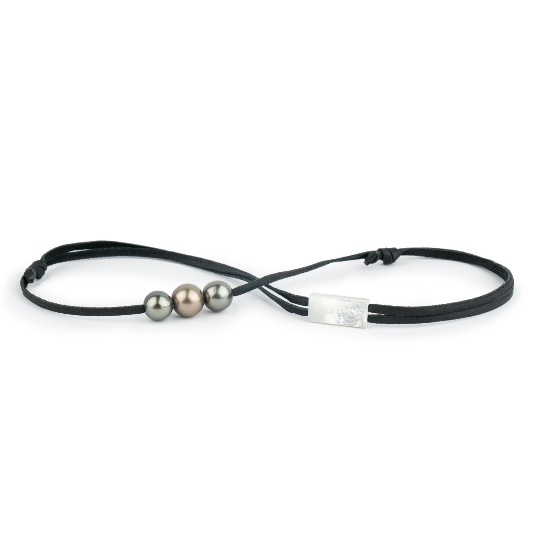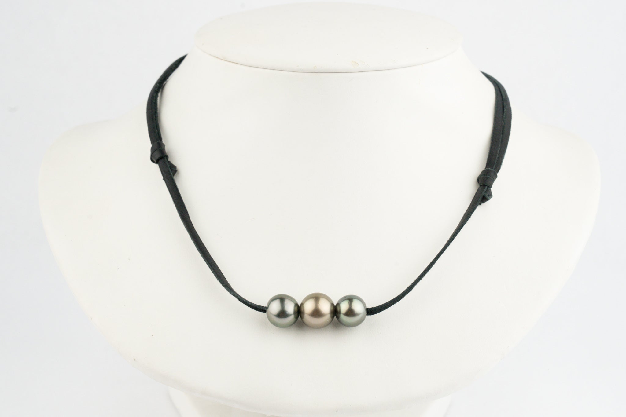 The "Mana Necklace" is the result of well over a decade of experience with pearls and leather. All three of the components: pearl, leather and mother-of-pearl bead, are things you can feel good about. We've named this triple pearl model after our Tahitian surf team rider Eimeo Czermak.