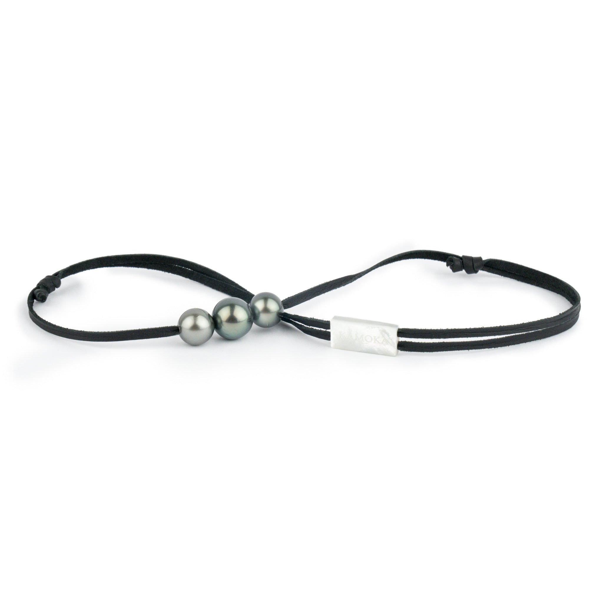 The "Mana Necklace" is the result of well over a decade of experience with pearls and leather. All three of the components: pearl, leather and mother-of-pearl bead, are things you can feel good about. We've named this triple pearl model after our Tahitian surf team rider Eimeo Czermak.
