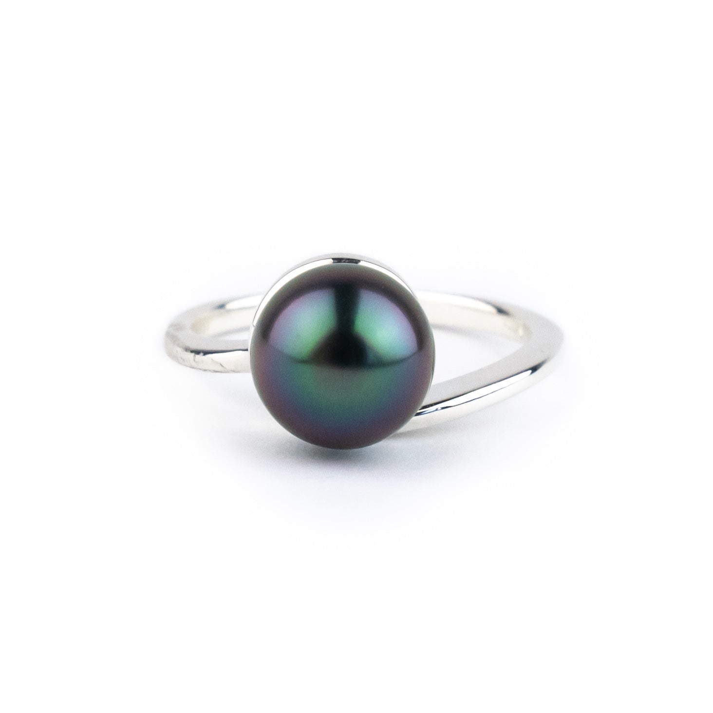 This 8.6mm, semi-baroque Tahitian pearl sits within a swirl, on a band of Sterling silver that shows off the pearl's beautiful assets.