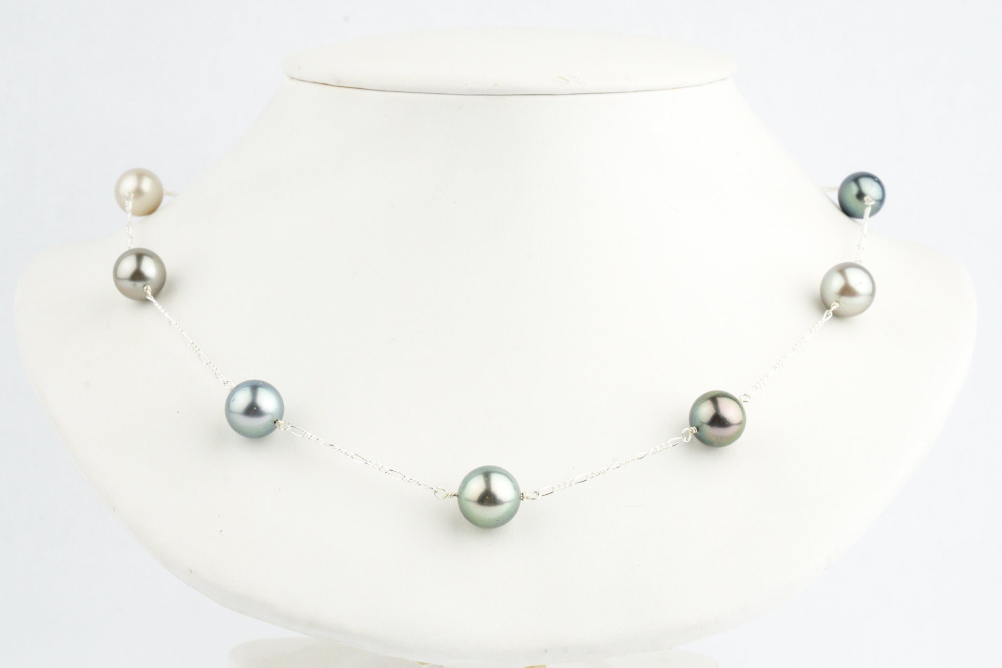 Seven stunning, flashy-hued Kamoka Tahitian pearls are strung on 1.5mm Figaro, Sterling silver chain creating an easy-to-wear, classic necklace commonly knows as a Tin-Cup, or station necklace. The pearls are strung about 1 1/2" inches apart with a longer chain section at the back for better drape and comfort.