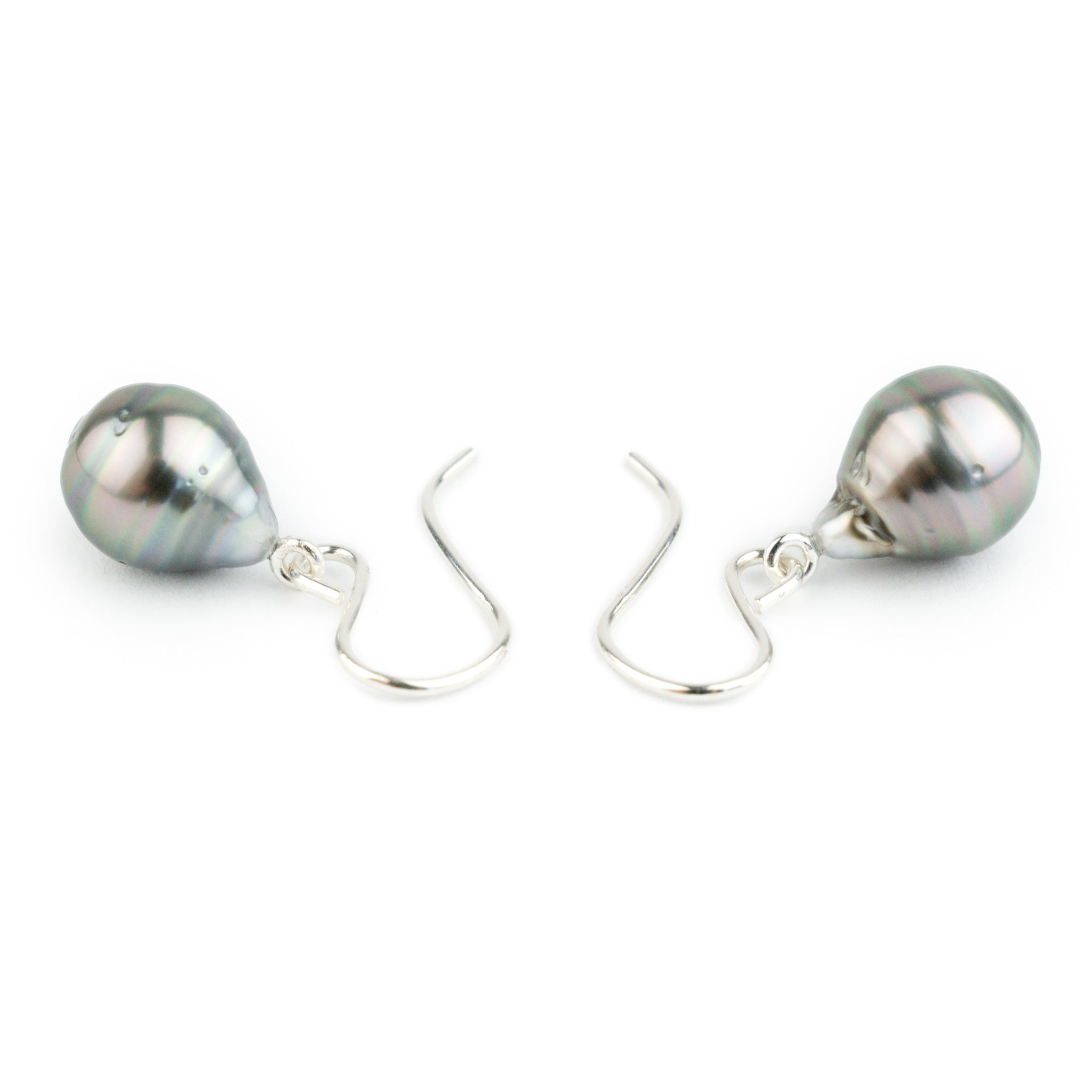 These stunning 8.7mm circle drop Tahitian pearls glow in a pink body, with lavenders to their center, and have blue and green bands throughout. There are imperfections that are drowned out by their coloration and luster.