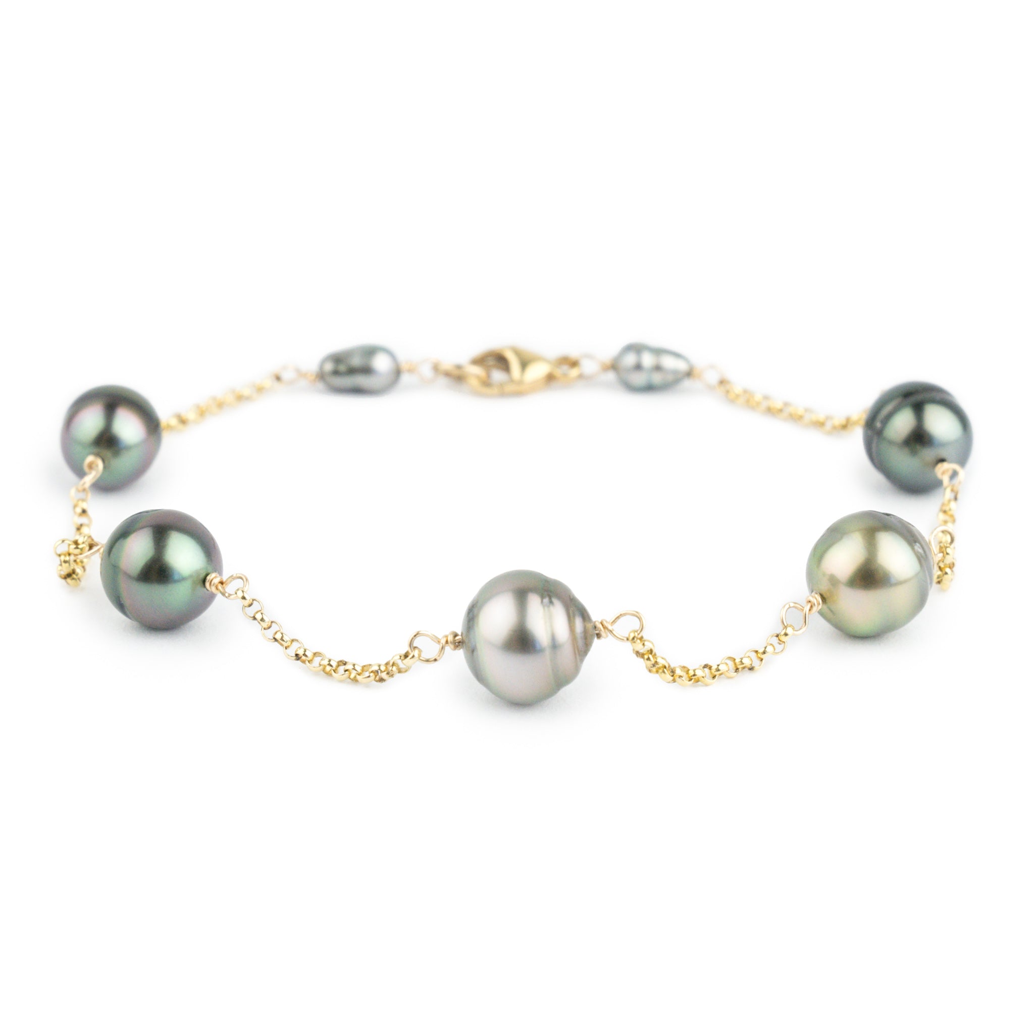 Five stunning imperfect Kamoka Tahitian pearls are strung on high quality 1mm, 14/20 gold filled chain creating an easy-to-wear, classic bracelet commonly knows as a Tin-Cup.