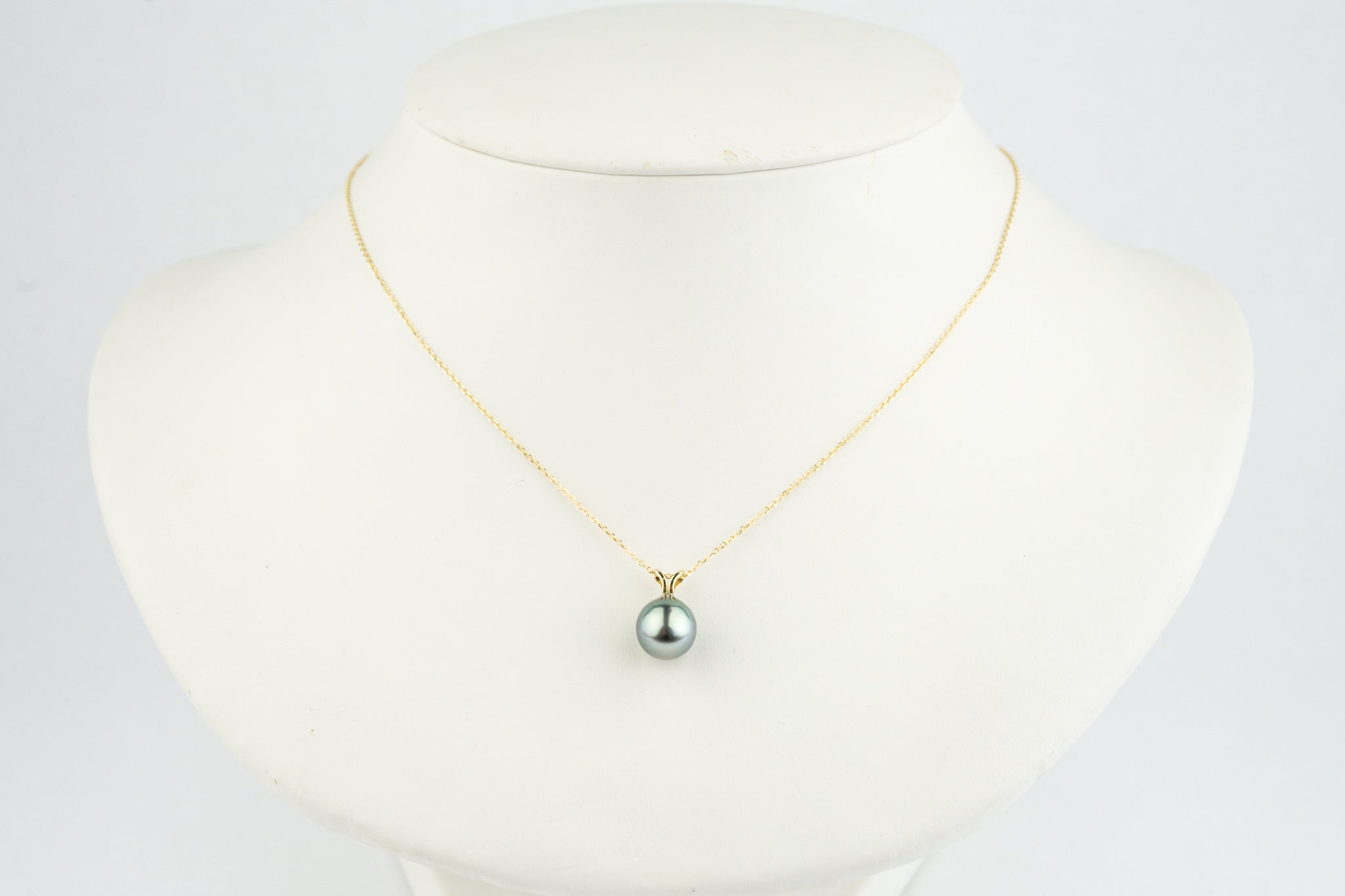The pearl mounted on a 14k yellow gold fish tail bale that dangles on a sparkling .9mm adjustable 16-18" 14k yellow gold chain.