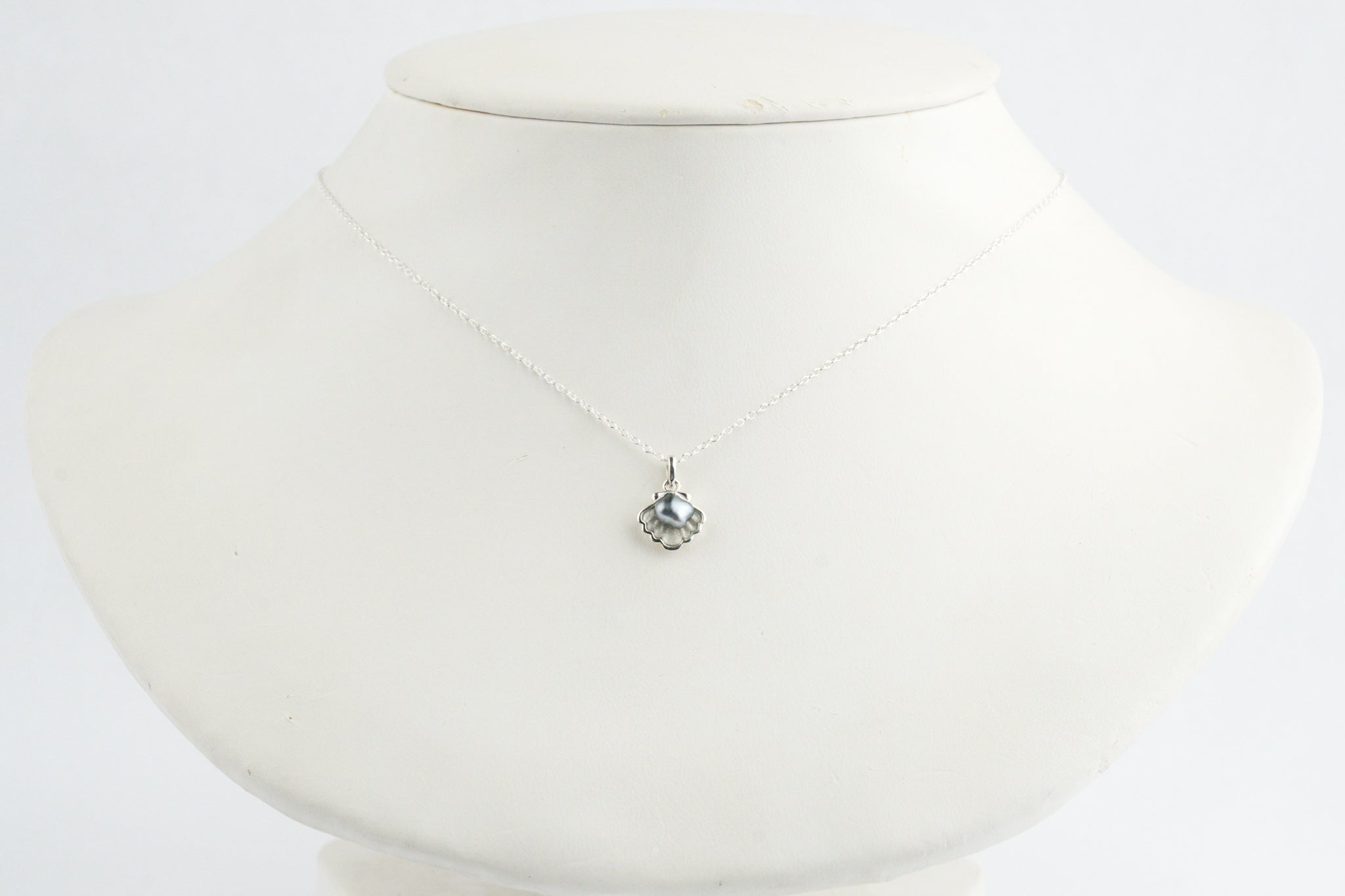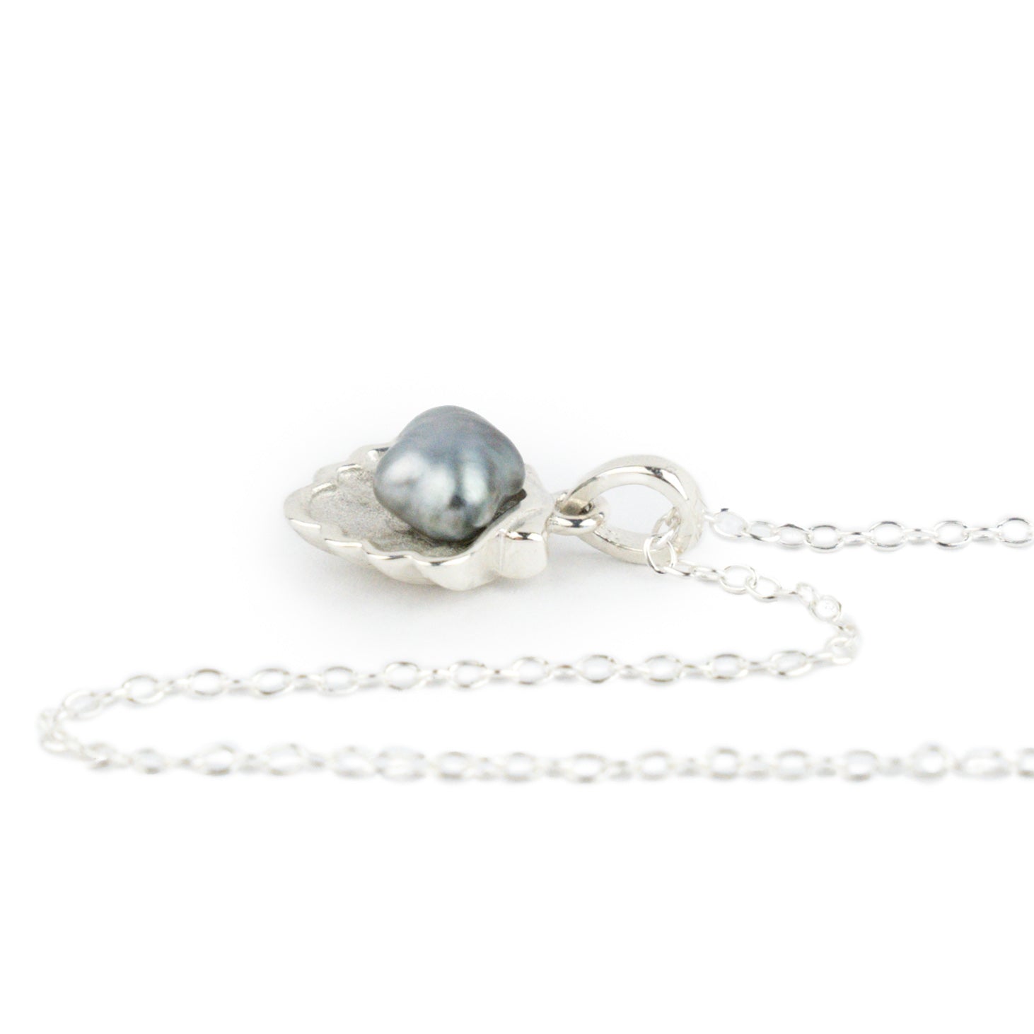 This dainty necklace features a 4.8mm baroque Tahitian keshi pearl inside a silver seashell. The Sterling silver shell dangles on a sparkling, adjustable, 16-17-18 inch, 1mm Sterling silver cable chain, perfect for everyday wear.